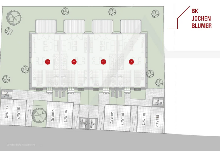 In einem sehr gepflegten, locker bebauten und familienfreundlichen Wohngebiet entstehen vier Stein auf Stein erstellte „Town-Häuser“.