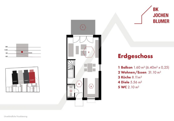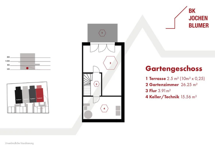 Wohn- und Schlafzimmern sowie hochwertige Fliesen in Bad und Flur erzeugen in Kombination mit der modernen und energiesparenden Heiztechnik Wohnkomfort auf höchstem Niveau. Die hervorragende Aufteilung bietet einen großzügigen Wohn-/Essbereich mit offener Küche, drei Schlafzimmer, ein komfortables Badezimmer mit bodengleicher Dusche und einer Badewanne sowie ein Gäste-WC. Zusätzlich sind ein Gartenzimmer im Untergeschoss und ein Studio im Dachgeschoss vorhanden. Die insgesamt 4 „Town-Häuser“ werden in sehr guter Massivbauweise erstellt.