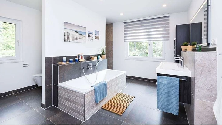 Im Obergeschoss befinden sich zwei Kinderzimmer sowie ein großzügiges Elternschlafzimmer mit separater Ankleide. Ein elegantes Badezimmer mit Dusche und Badewanne sowie ein Abstellraum bieten zusätzlichen Komfort. Das Haus ist QNG zertifizierbar. Somit ist für Sie (Familie mit 1-2 Kinder) die höchste Förderstufe der KfW-Förderung „Wohneigentum für Familien“ möglich und Sie profitieren von zinsgünstigen Krediten, die Ihnen die Finanzierung noch einmal zusätzlich erleichtern. Ob für Sie weitere Fördermöglichkeiten in Frage kommen, klären wir gerne in einem persönlichen Beratungsgespräch. Eine moderne Ausstattung wie Fußbodenheizung, eine Luft-Wasser-Wärmepumpe und eine PV-Anlage mit Batteriespeicher garantieren nachhaltigen Wohnkomfort und hohe Energieeffizienz. Ausbaustufe schlüsselfertig (inkl. Bodenbeläge, Spachtel- und Malerarbeiten und Innentüren)