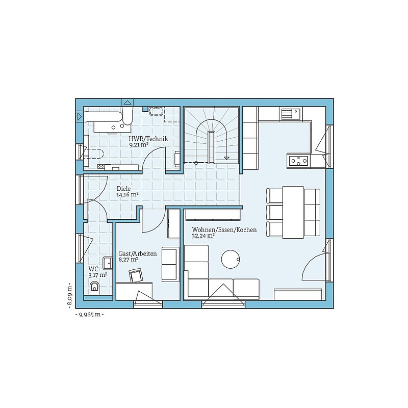 Im Erdgeschoss befinden sich der großzügige Wohn- und Essbereich mit offener Küche, Technikraum, Gäste-WC sowie ein Zimmer welches als Gäste- oder Arbeitszimmer genutzt werden kann.