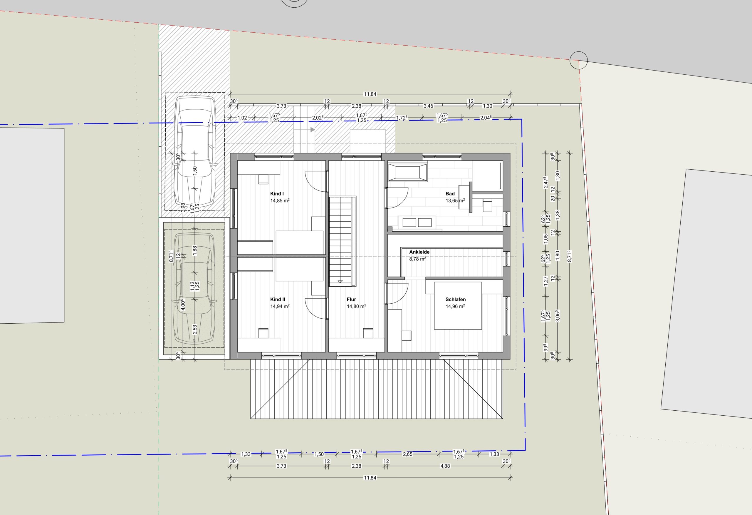Das Obergeschoss umfasst ein großes Elternschlafzimmer mit Ankleide, zwei Kinderzimmer und ein geräumiges Badezimmer.